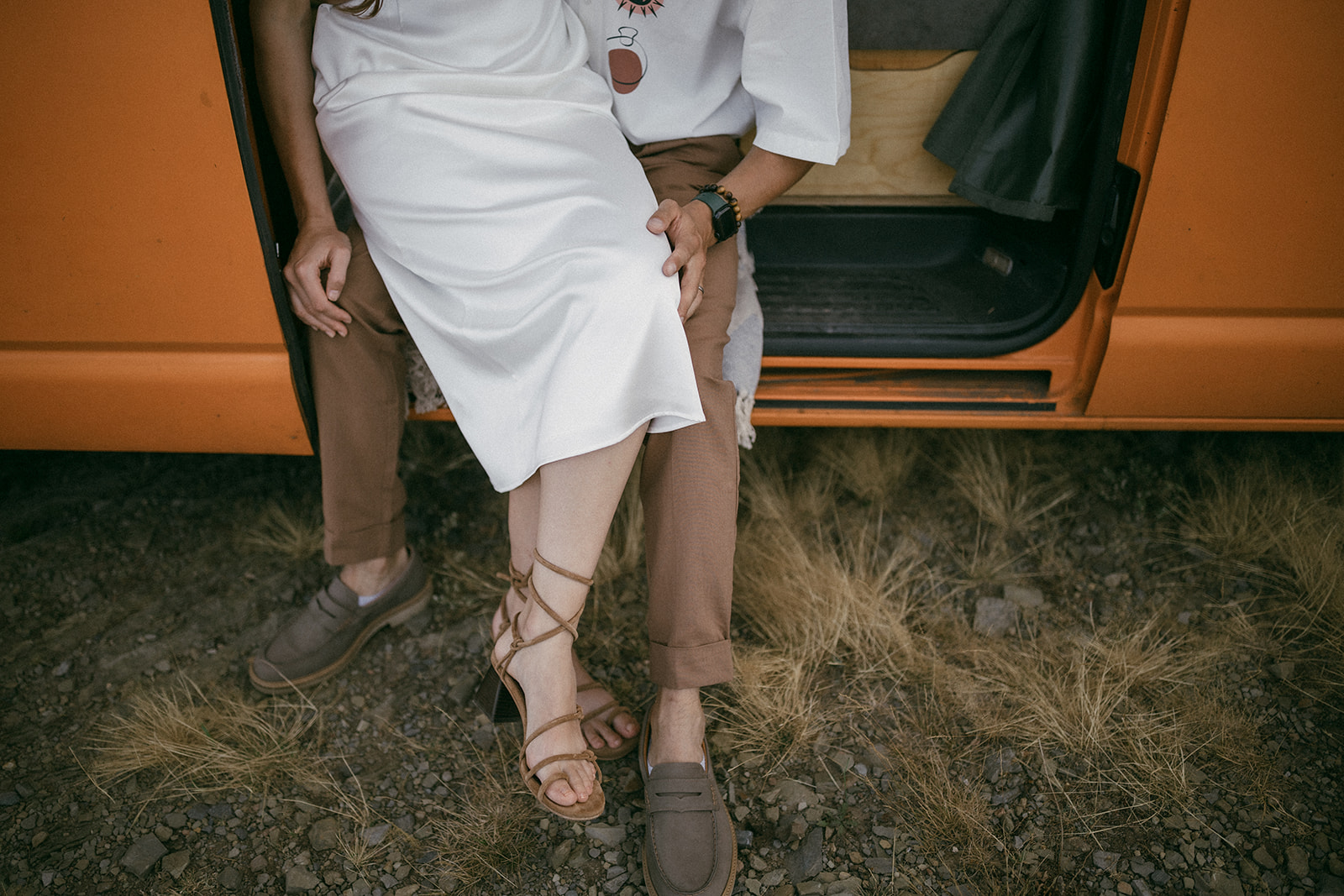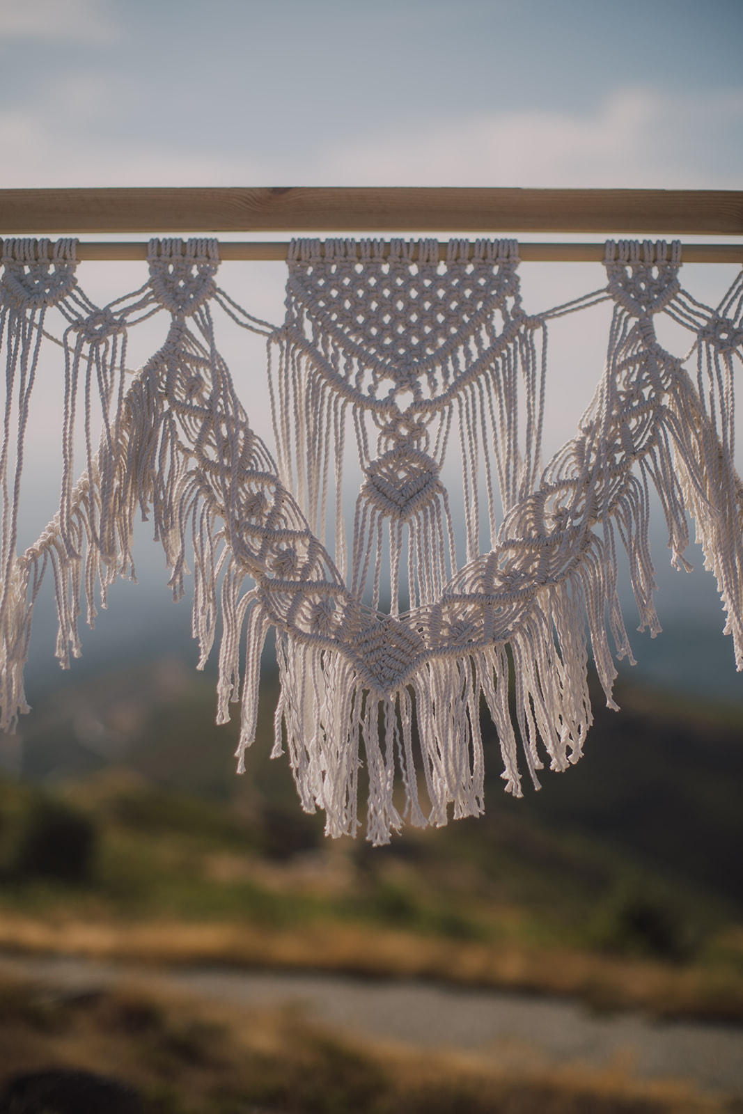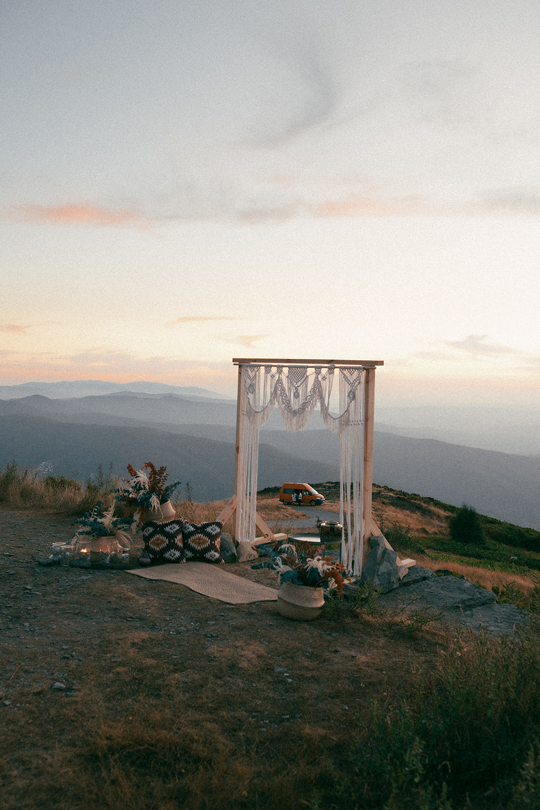 Travelling from Lithuania to Portugal in their bright orange van, they carried something very special with them: their own wedding arch. The groom built the wooden structure himself, while the bride patiently hand-knotted a macramé backdrop for it. During their long journey across Europe, the arch quietly became part of their story — almost as if they were weaving their vows into it along the way.