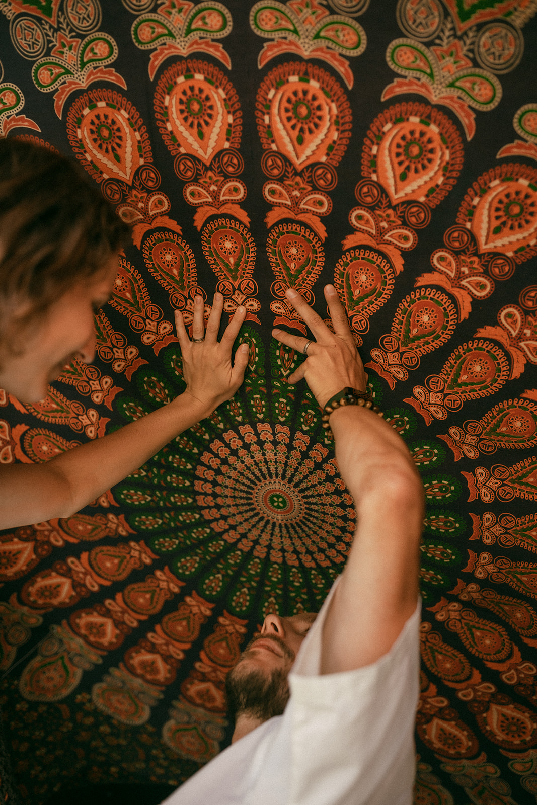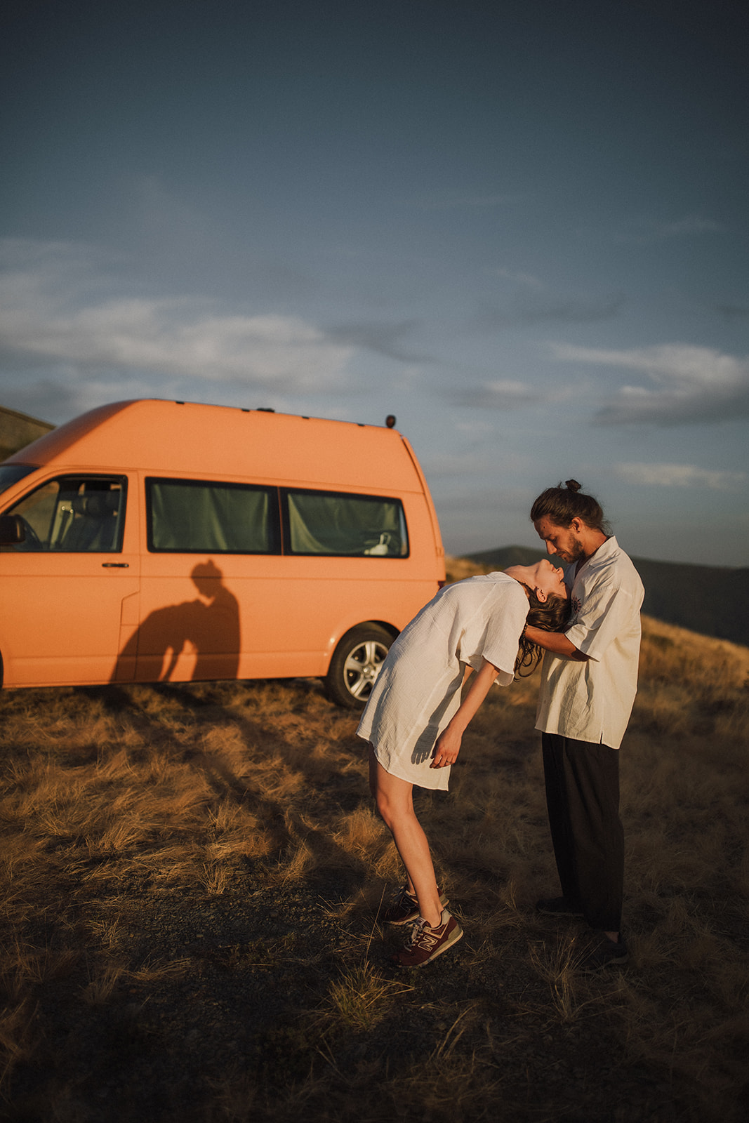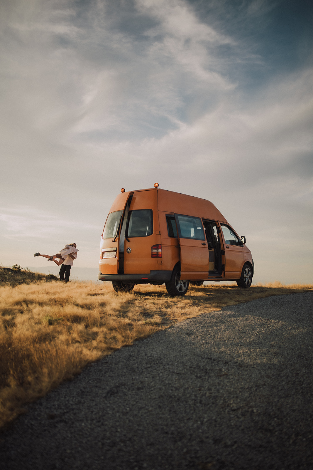 Travelling from Lithuania to Portugal in their bright orange van, they carried something very special with them: their own wedding arch. The groom built the wooden structure himself, while the bride patiently hand-knotted a macramé backdrop for it. During their long journey across Europe, the arch quietly became part of their story — almost as if they were weaving their vows into it along the way.