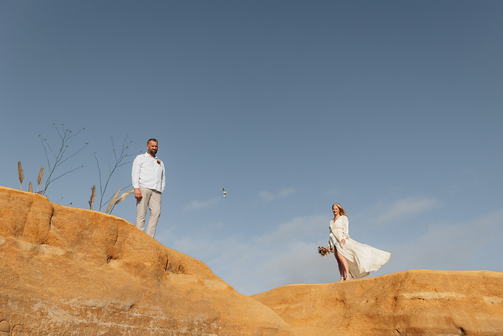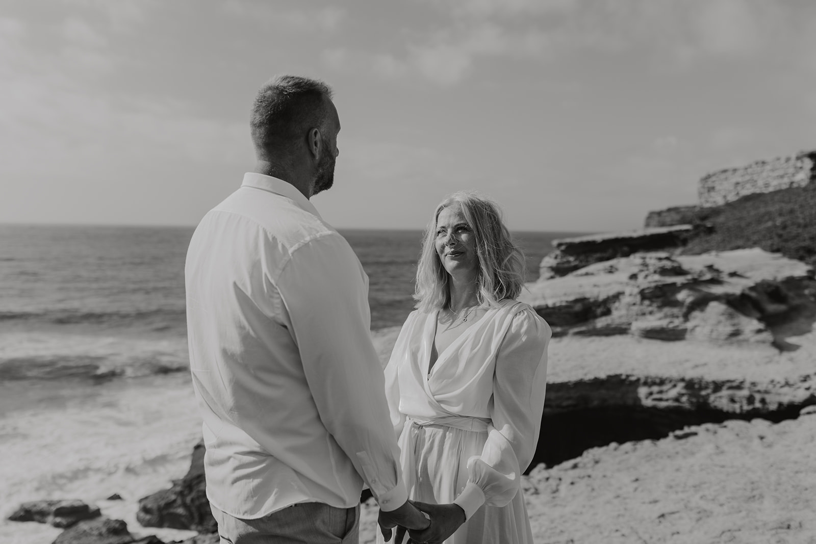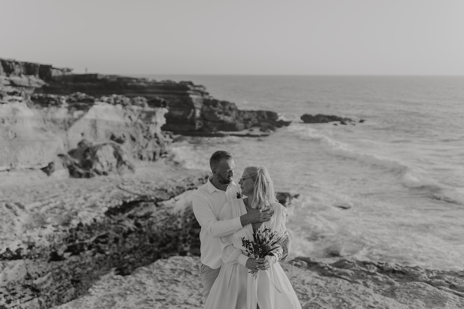 Aušra and Vaidas traveled from Lithuania to exchange their vows on the golden cliffs of Ericeira, where the Atlantic waves crash dramatically against the rocks below. Their civil ceremony was intimate and windswept—just the two of them, surrounded by raw nature and endless ocean views.