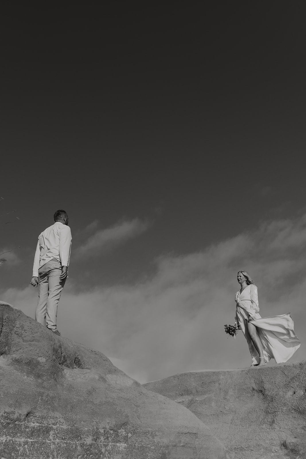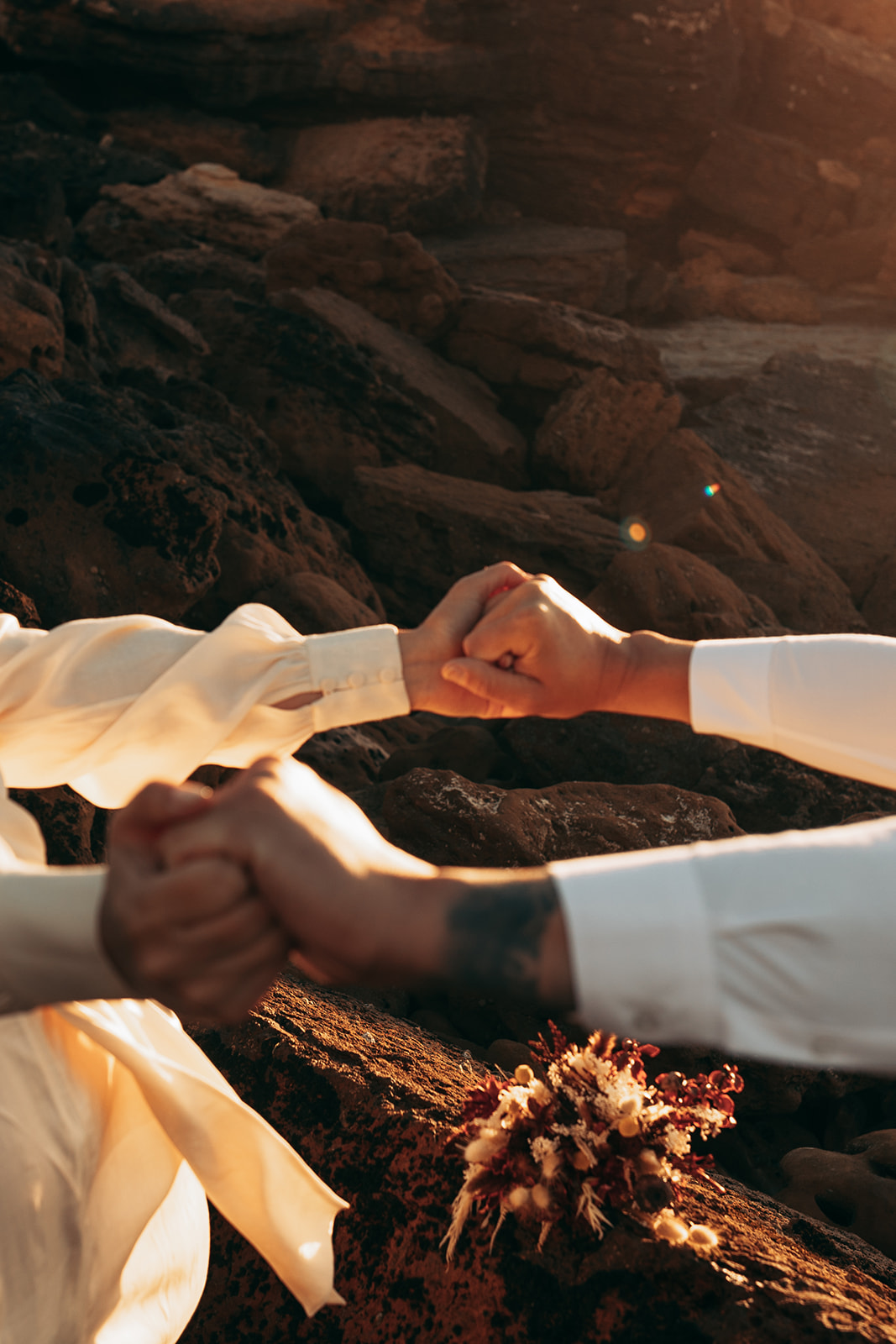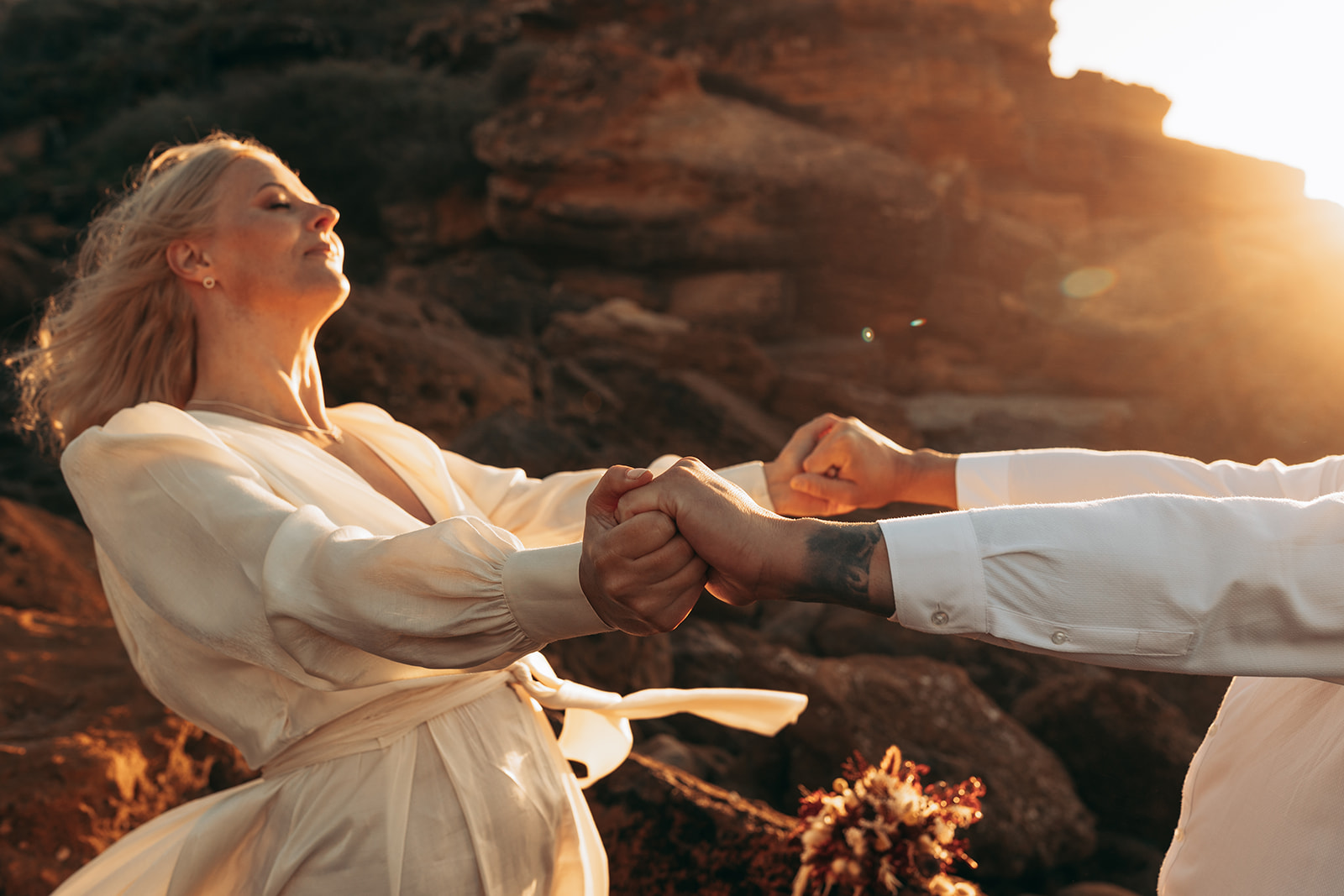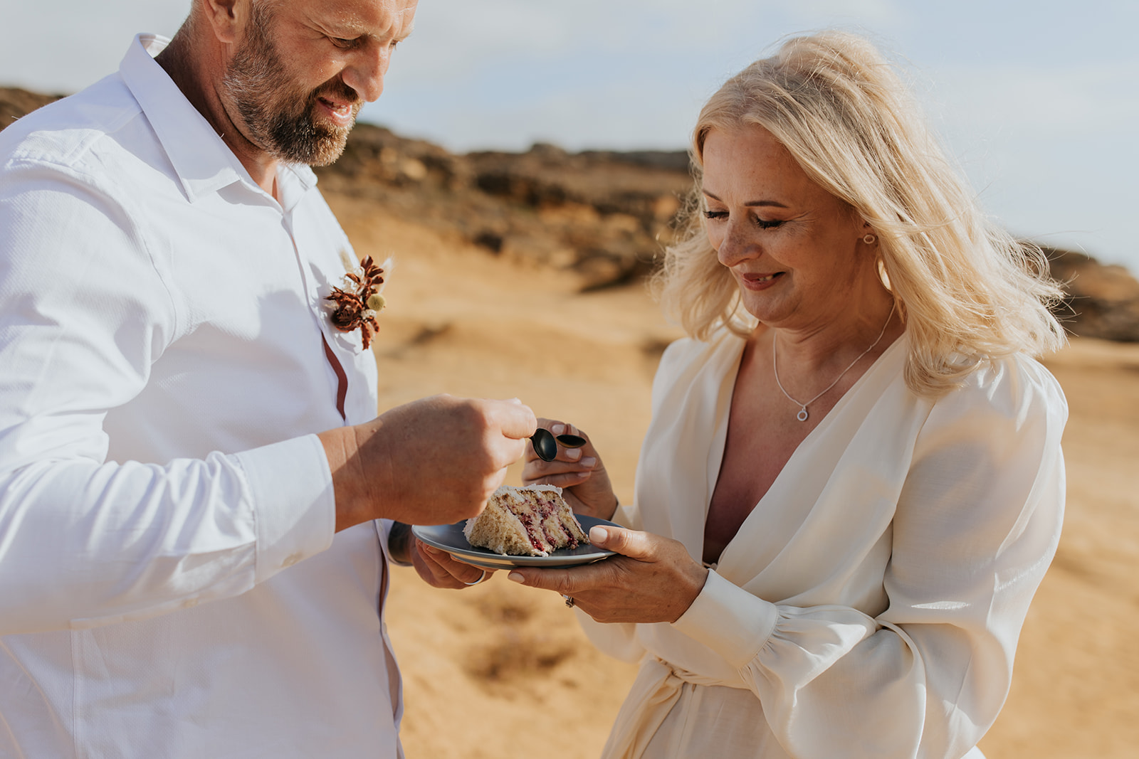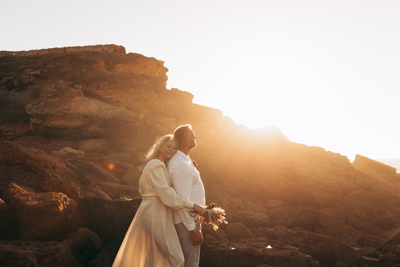 After saying “I do,” they celebrated with champagne and cake—just enough to share with the photographer and wedding planner who witnessed their moment. As the sun slowly dipped into the horizon, the cliffs turned warm and golden, creating a backdrop so breathtaking that every photograph felt frame-worthy.